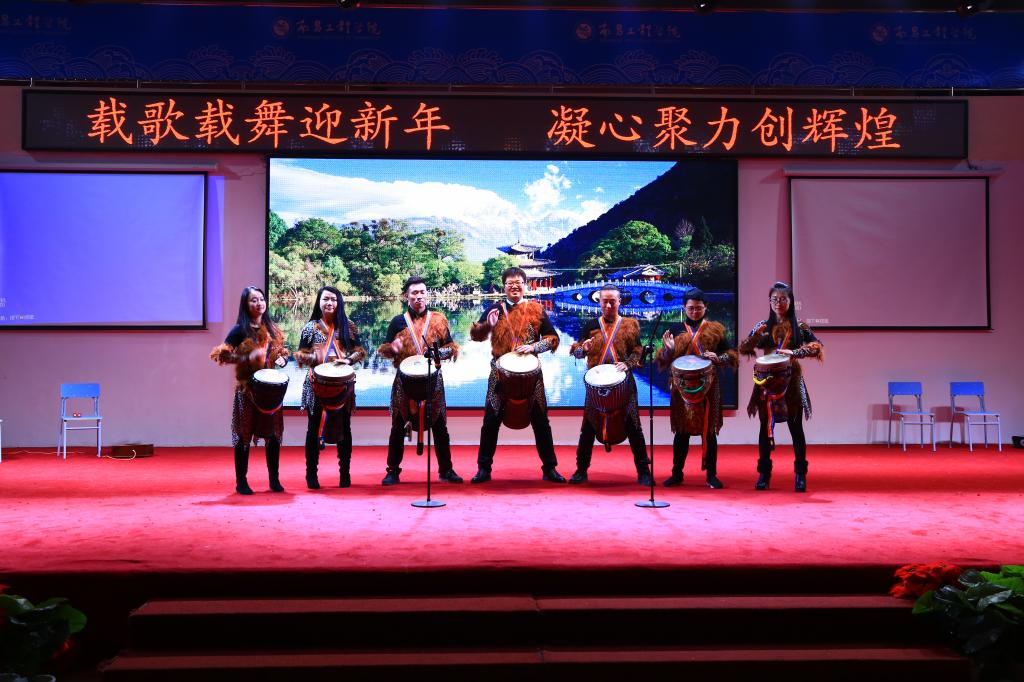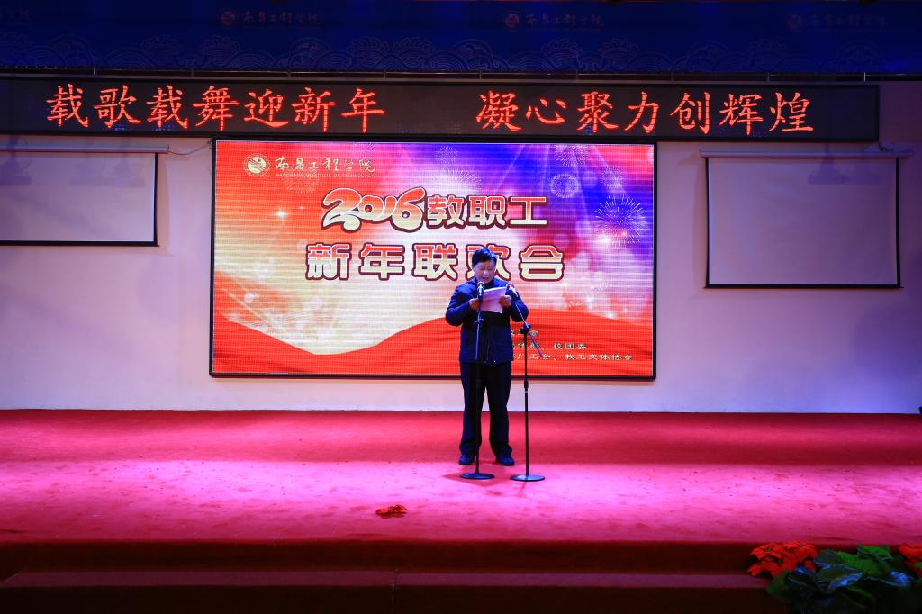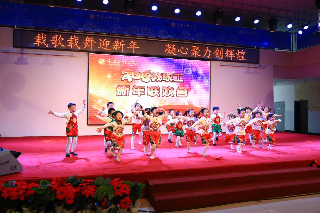 校幼儿园选送的开场舞《中国范儿》拉开了联欢会的序幕。在热烈的掌声中,校党委书记刘谟炎走上舞台致新年贺辞。他对一年来奋战在教学、科研、管理服务等各领域的教职工表示衷心的感谢和节日的祝福,并简要回顾了一年来学校的主要工作和取得的成绩。他指出,2015年是南昌工程学院发展过程中具有重大意义的一年。学校深入学习贯彻党的十八大和十八届三中、四中、五中全会精神,在全校党员干部和全体教师中开展了“三严三实”主题教育活动,提高了素质,凝聚了力量。学校坚持创新发展、内涵发展、特色发展,抢抓机遇,深化改革,学科建设成效明显,教学质量稳步提高,科研实力不断增强,内部管理机制进一步完善,办学条件得到改善,意识形态和思想文化建设迈上新台阶,社会声誉逐年提升。学校坚持德育为先、育人为本,促进学生健康成才和就业创业,毕业生创业人数连续两年居全省高校十强,学生荣获全国“挑战杯”一等奖、首届全国高校工程造价技术及创新竞赛团体及个人多个一等奖、大学生篮球联赛“阳光组”全国第四名等多个奖项。他希望,2016年广大师生员工能轻装上阵、携手并进,以更远的战略视野、更强的拼搏精神、更高的工作热情,同心同德、同心同向、同心同行,不断推动学校科学发展、健康发展、和谐发展,为早日建成水利特色鲜明的高水平应用型工程大学而努力奋斗。