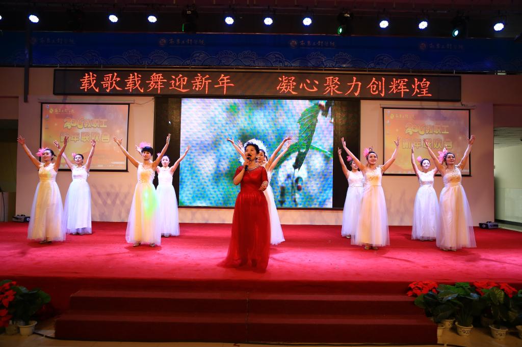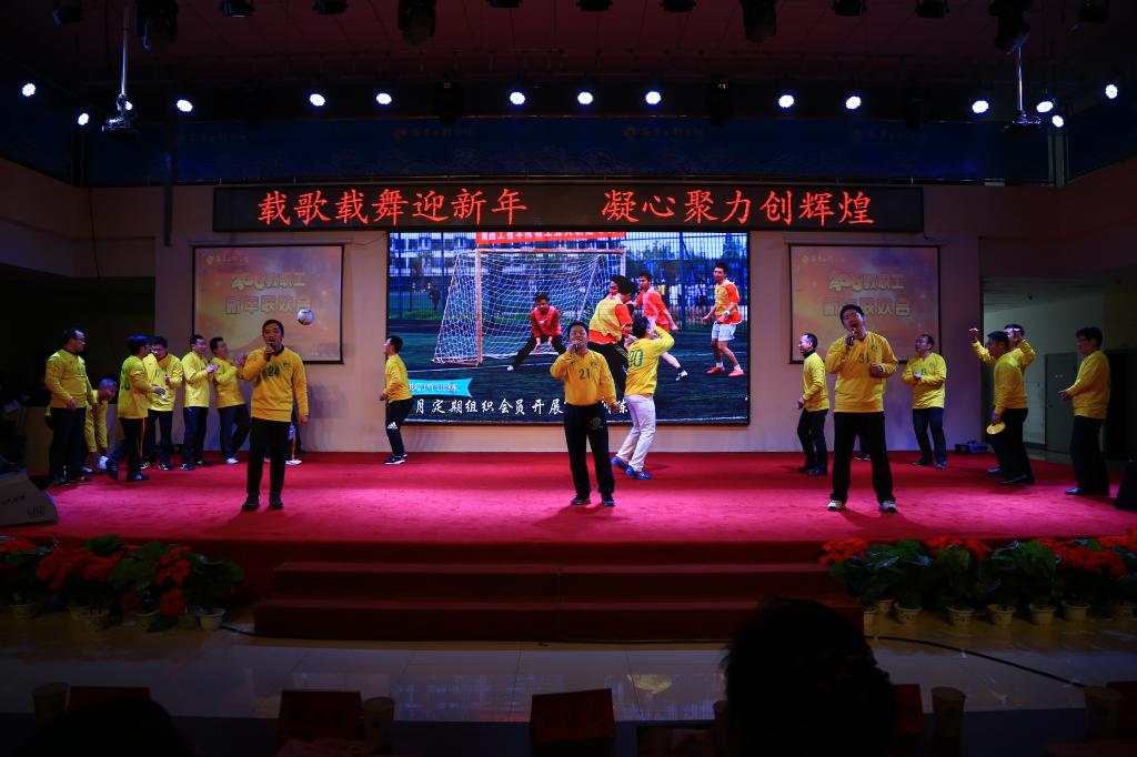 联欢会内容丰富多彩,气氛活泼热烈。教工舞蹈协会、教工足球俱乐部、各职能部门选送的舞蹈、朗诵、合唱、戏曲联唱等节目次第上演,得到了广大师生的高度赞誉和欢迎。配乐诗朗诵《我骄傲,我是一名教师》激昂高亢,感人肺腑;校领导的合唱《共和国之恋》深情款款,博得现场阵阵掌声;歌曲《如果没有你》、歌伴舞《绒花》、小合唱《超越》、戏曲联唱、非洲鼓《巴拉库兰加》及吉他弹唱《一瞬间》等演唱节目悠扬深远,精彩非凡;舞蹈《渔家姑娘》、亲子舞蹈《小苹果》、工间操《劳动最光荣》等节目舞姿曼妙,或婉转优雅,或激昂欢快,传递出喜迎新年的美好心情。演出中还穿插了有趣的游戏和抽奖活动,给全体观众带来了惊喜。