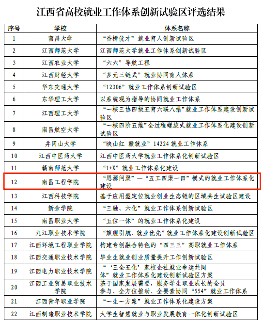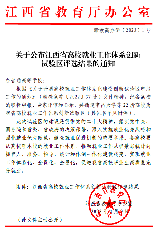 近日,江西省教育厅办公室印发《关于公布江西省高校就业工作体系创新试验区评选结果的通知》,我校成功入选。