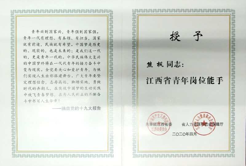 近日,在共青团江西省委、江西省人力资源社会保障厅开展的江西省青年岗位能手评选中,我校青年教师熊枫荣获“江西省青年岗位能手”荣誉称号。(文/图 王丹)