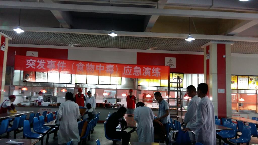 为提高我校卫生应急水平,检验应急指挥和组织协调能力,提高应急队伍素质,校医院联合学校后勤保障处于4月21日下午在一食堂一楼举行了突发公共卫生事件(食物中毒)应急演练。