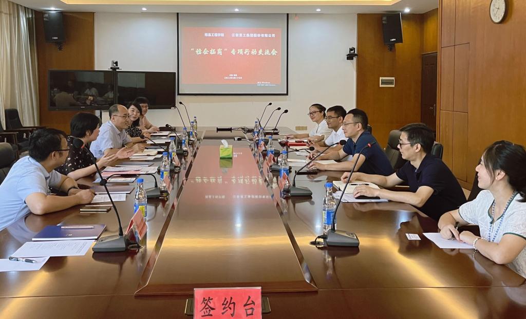 8月23日上午,副校长周敏丹率招生就业处、电气工程学院和外国语学院有关负责人到江联重工集团股份有限公司开展访企拓岗促就业专项行动。江联重工集团股份有限公司总裁范骥、副总裁余新红、人力资源总监孙飞等出席活动。双方签订了就业基地协议并为基地授牌。