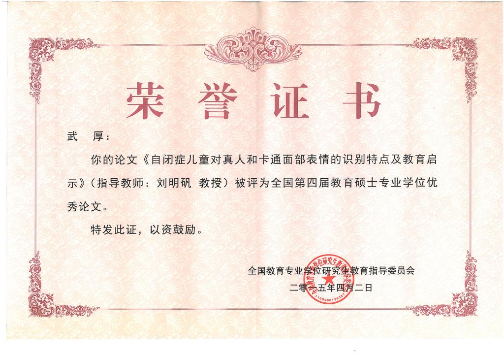 近日,全国教育硕士专业学位教育指导委员会发布《关于全国第四届优秀教育硕士专业学位论文评审决定工作通知》(教指委发[2015]02号),公布了本届评选出的74篇全国优秀教育硕士专业学位论文,其中我校大学生心理健康教育与咨询中心教师武厚的论文《自闭症儿童对真人和卡通面部表情的识别特点及教育启示》被评为“全国第四届教育硕士专业学位优秀论文”。据悉,此篇获奖论文是本届评选江西省唯一的一篇优秀论文。(大学生心理健康教育与咨询中心)