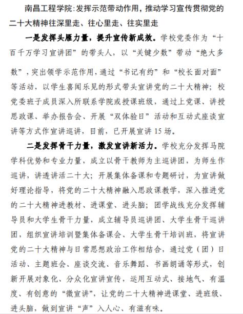 近日,《江西教育工作情况》以《南昌工程学院:发挥示范带动作用,推动学习宣传贯彻党的二十大精神往深里走、往心里走、往实里走》为题,刊发了我校推进学习宣传贯彻党的二十大精神工作案例。