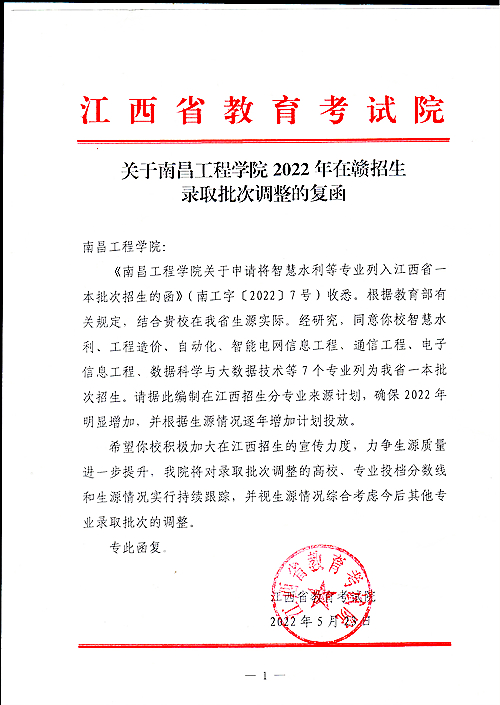 近日,江西省教育考试院发来《关于南昌工程学院2022年在赣招生录取批次调整的复函》,我校智慧水利、工程造价、自动化、智能电网信息工程、通信工程、电子信息工程、数据科学与大数据技术等7个专业获批列入我省一本批次招生。