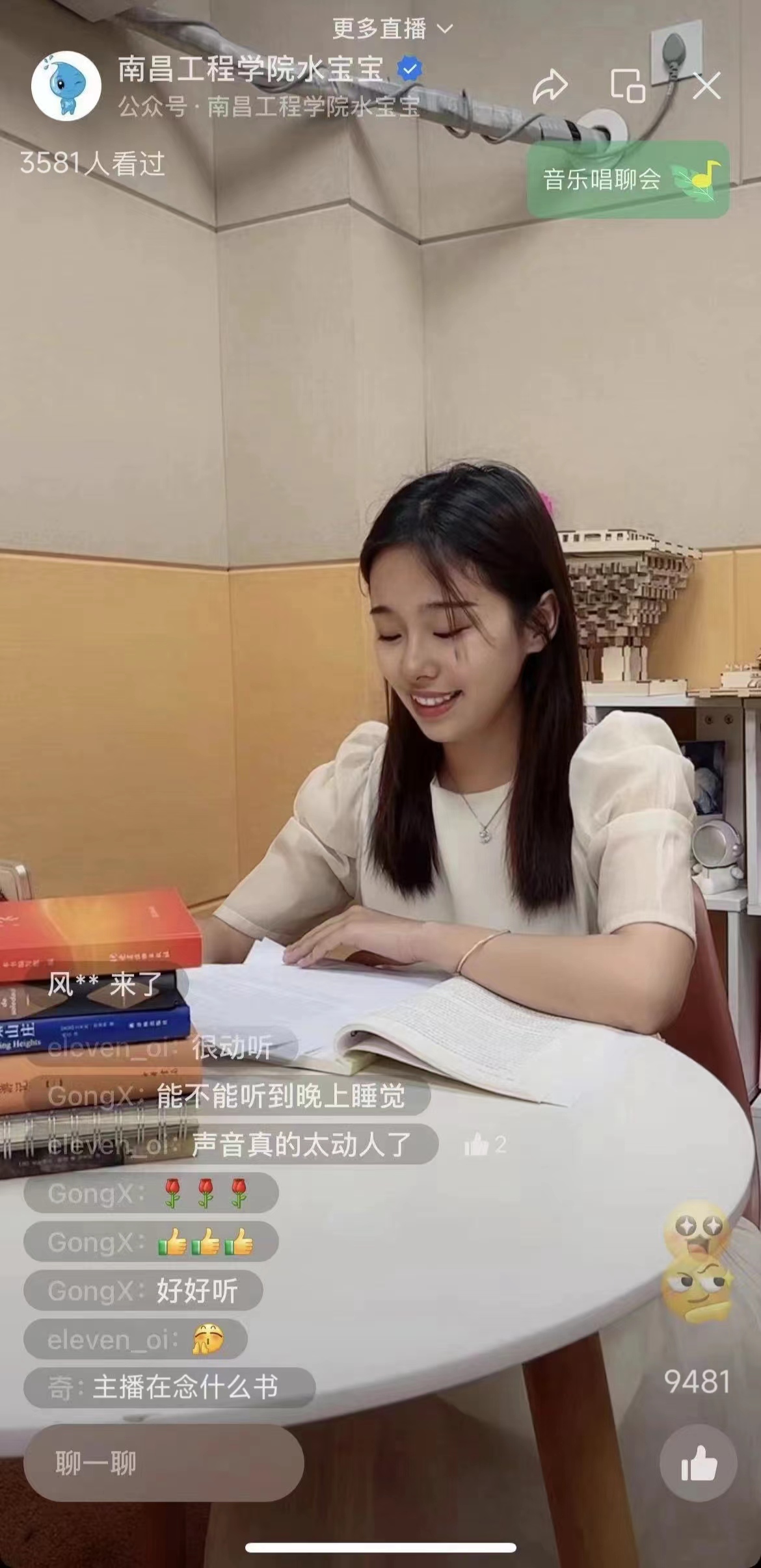 达人引读,大众“悦”读。4月19日至23日,校广播台选取“古词的风骨”“生活与远方”“书香致远”三个主题,依托喜马拉雅有声图书馆,通过“南昌工程学院水宝宝”视频号直播的形式,开展“悦”读慢直播线上阅读活动,主播通过阅读书籍与线上听众进行互动,吸引了5000余人在线观看,1.5万人次点赞。