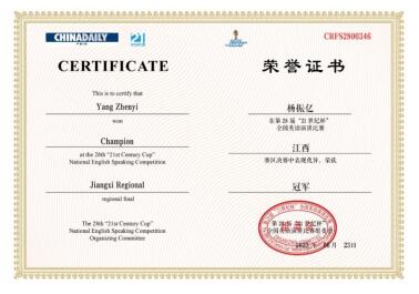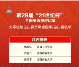 近日,第28届“21世纪杯”全国英语演讲比赛江西赛区决赛顺利结束,我校外国语学院2020级翻译专业杨振亿同学获得江西赛区决赛冠军,并将于8月代表江西赛区参加全国决赛。