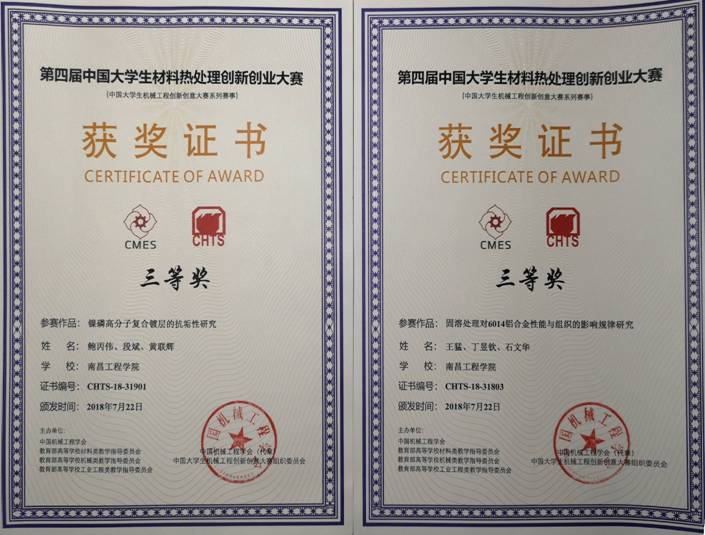 7月20日-22日,第四届中国大学生材料热处理创新创业大赛在河南科技大学举行。来自清华大学、哈尔滨工业大学、天津大学等全国各地的111支高校代表队参赛。本次比赛分为作品答辩和材料热处理基础知识问答两个环节。经过预赛、决赛的激烈比拼,我校机械与电气工程学院沈智、何雪龙老师指导,王猛、石文华、丁昱钦同学设计制作的作品《固溶处理对6014铝合金性能与组织的影响规律》;付凯、罗沛兰老师指导,鲍丙伟、段斌、黄联辉同学设计制作的作品《镍磷高分子镀层的抗垢性研究》在比赛中取得优异成绩,均荣获大赛三等奖。(文/图 沈智)
