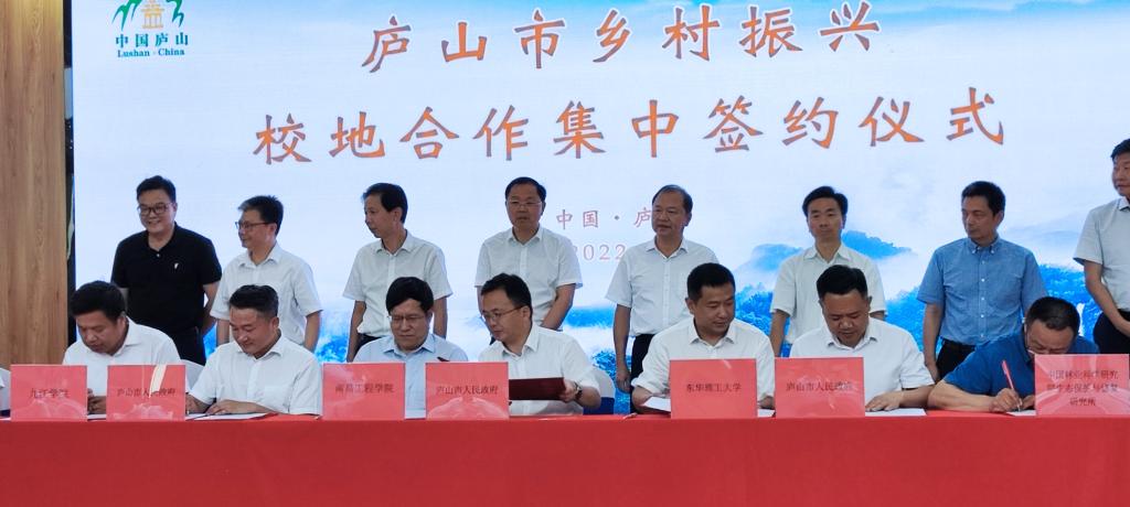 7月30日,庐山市乡村振兴校地合作集中签约仪式在庐山市海会镇举行,校长汪胜前代表我校与庐山市签订校地战略合作协议。江西省农业农村厅、九江市、庐山市相关领导以及学校发展规划处负责人出席签约仪式。