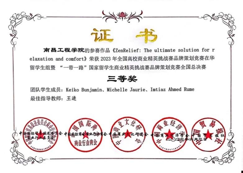 近日,2023年全国高校商业精英挑战赛品牌策划竞赛在华留学生组暨2023年“一带一路”国家留学生商业精英挑战赛品牌策划竞赛在首都体育学院举行,来自全国高校30余支参赛队伍入围比赛。由我校经济贸易学院王进老师指导,印尼籍留学生KEIKO BUNJAMIN和MICHELLE JAURIE、孟加拉籍留学生IMTIAZ AHMED RUME组成的参赛队经过激烈角逐,荣获2023年全国总决赛三等奖。(文/姜园兰 图/IMTIAZ AHMED RUME 责任编辑 潘旭 罗婷)