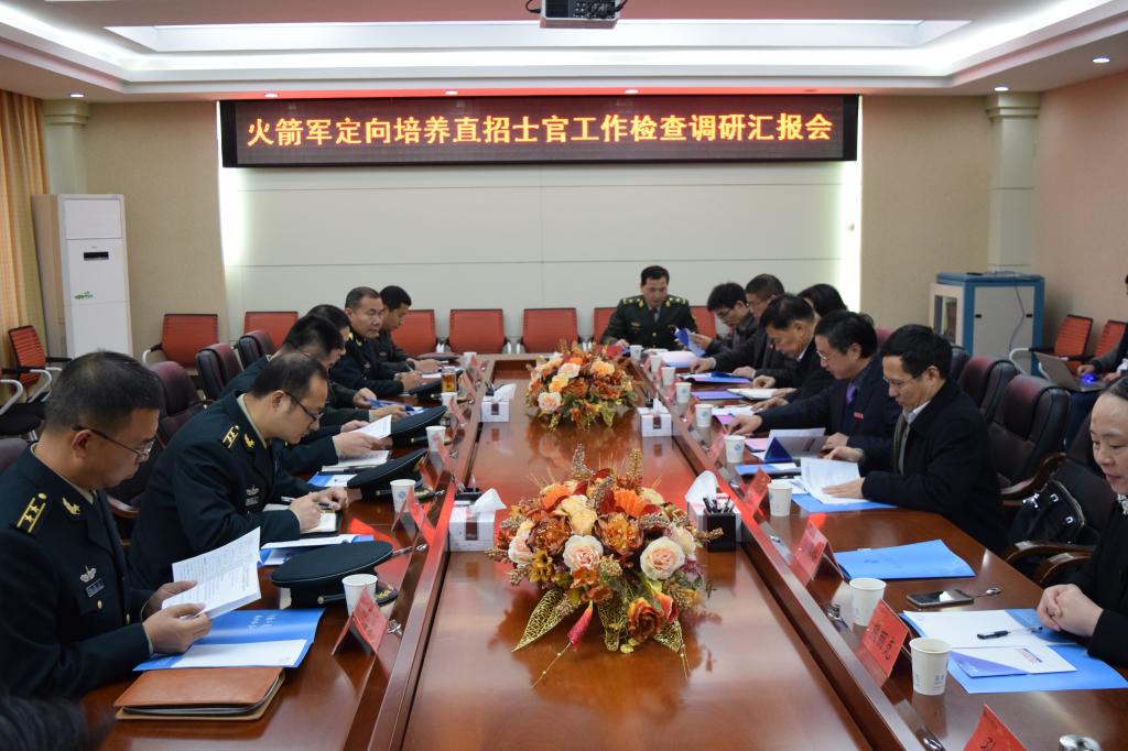 12月14日,中国人民解放军火箭军参谋部部队管理局副局长雷红兵一行四人莅临我校,对定向培养直招士官生进行检查调研。江西省人民政府征兵办公室副主任、省军区军务动员处处长程宝根、火箭军96647部队某团总工程师赵冠龙,我校校长金志农、副校长汪胜前、胡敏,教务处、学工处、招生就业处、机械与电气学院、信息工程学院、军事教育学院等单位负责人陪同调研。