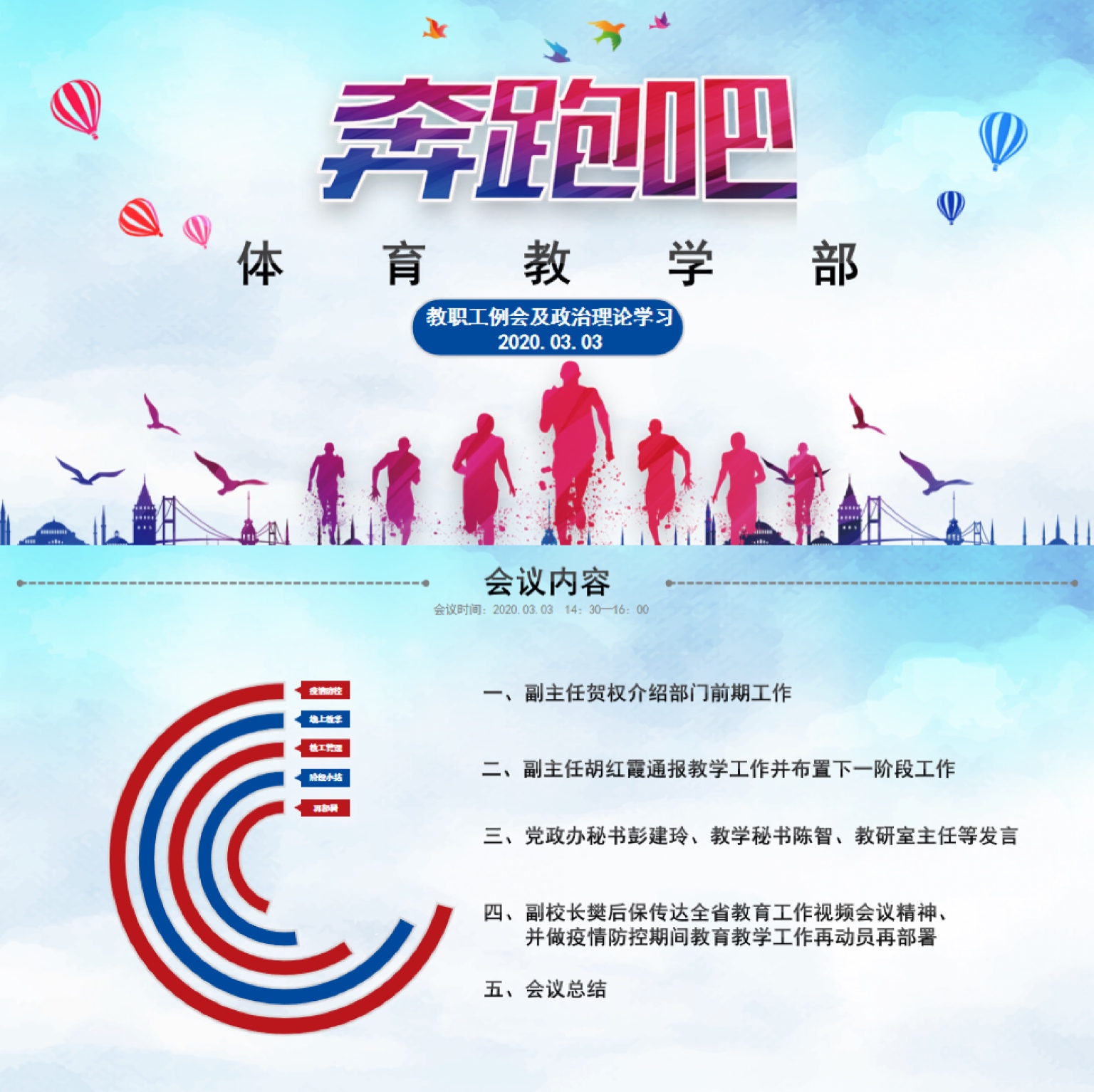 3月3日下午,体育教学部通过“钉钉”会议平台召开新学期全体教职工大会。副校长樊后保到会指导。会议传达学习了习近平总书记关于新冠肺炎疫情防控的系列重要讲话和指示精神,对前一阶段的疫情防控、线上教学、爱心捐款等工作进行了通报,对“教师不停教、学生不停学、居家不停练”相关工作进行了再次部署,明确了“上好一门课,当好教练员”的工作思路,对做好下一步疫情防控工作进行了具体安排。