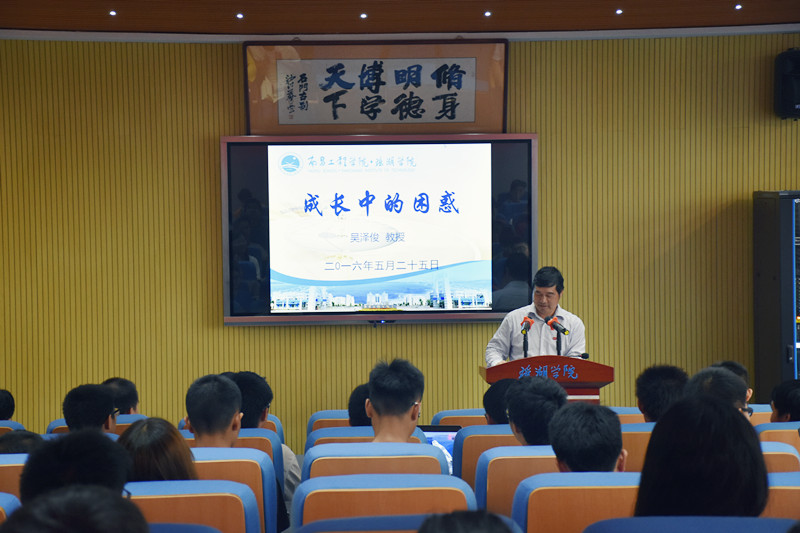 吴泽俊教授以一名师兄的身份,围绕瑶湖学院人才培养目标和院训精神,结合自身经历和校友的故事,用生动幽默的语言,从学科知识构架、多种能力学习、综合素养展现等方面为学生解疑答惑。他还在报告会中指出,同学们要尽早确立自己的目标,学习多门学科知识,提高学习能力、沟通能力和资源整合能力,争做阳光自信、责任感和创新意识强、人文素养和身体素质高的南工人。