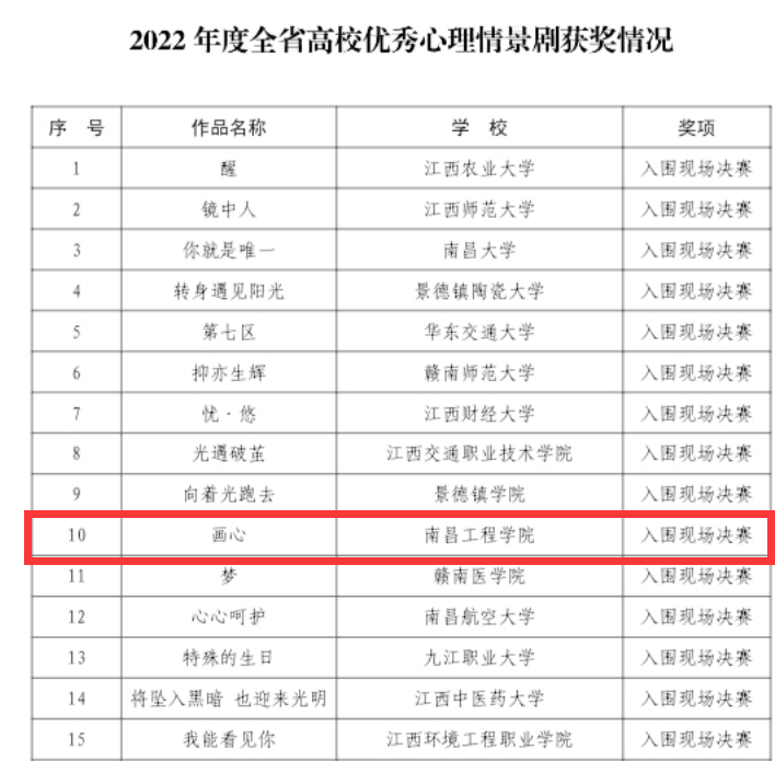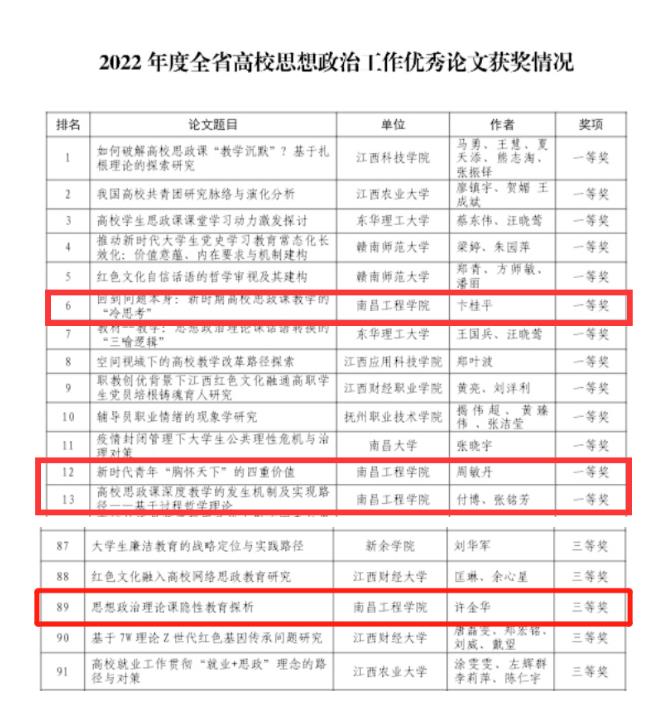 近日,2022年度江西省高校思想政治工作优秀论文征集活动及2022年江西省大学生“5·25”心理健康教育月系列活动评选结果揭晓,我校副校长周敏丹的论文《新时代青年“胸怀天下”的四重价值》、马克思主义学院教师卞桂平的论文《回到问题本身:新时期高校思政课教学的“冷思考”》、电气工程学院辅导员付博的论文《高校思政课深度教学的发生机制及实现路径——基于过程哲学理论》荣获一等奖,马克思主义学院院长许金华的论文《思想政治理论课隐性教育探析》荣获三等奖,大学生心理健康教育与咨询中心选送的心理情景剧《画心》入围现场决赛。