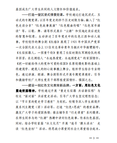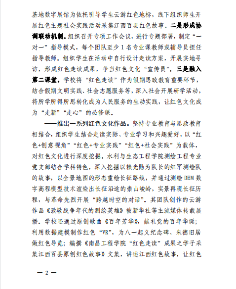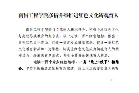 近日,《江西教育工作情况》(2022年第25期)以《南昌工程学院多措并举推进红色文化铸魂育人》为题,刊发了我校红色文化教育工作情况。文章介绍了近年来,我校以“走读一百个红色地标、推出一系列红色文化作品、打造一堂沉浸式情景党课、建设一批红色文化教育新品牌”为举措,充分挖掘江西红色资源,积极拓展思政教育新渠道,在全校形成了教育多形式、师生全覆盖的铸魂育人格局,让红色文化成为“走新”“走心”的必修课。(文/图 吴京颖 责任编辑 潘旭 陈巧雄)