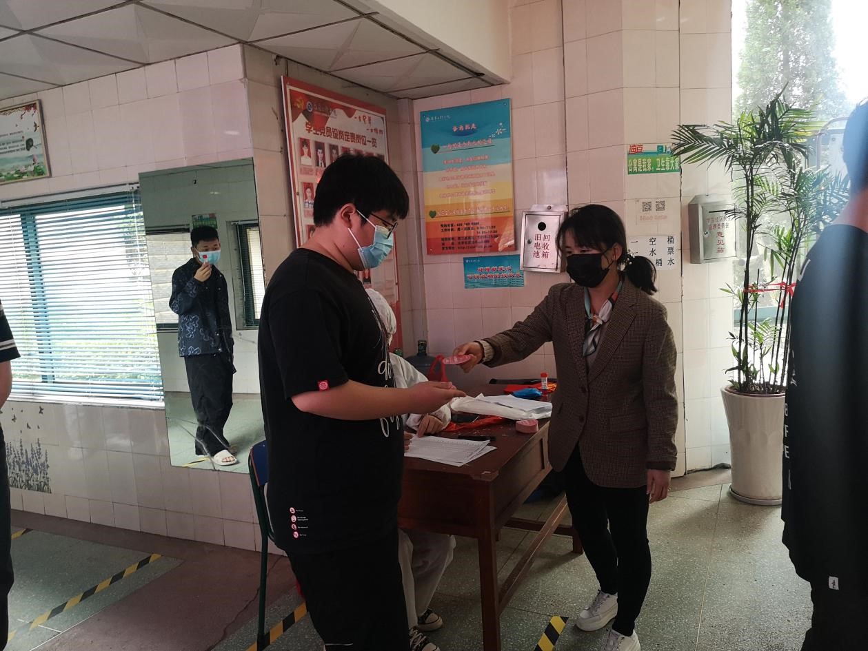 在本次的第二次全员核酸检测中,学院领导、教师党员、学生党员全员上阵,与时间赛跑,与病毒较量,分别在学四栋、学五栋进行志愿服务,倾尽全力守护我们的大家庭。