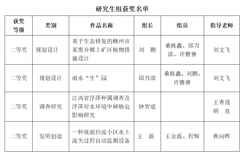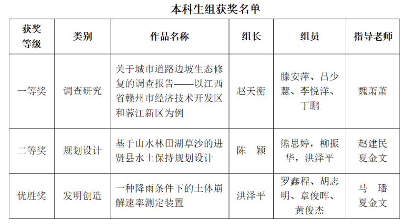 12月3日,南方水土保持研究会第一届水土保持专业大学生创新创业大赛颁奖仪式以线上形式举行。我校参赛作品获研究生组二等奖4项,本科生组一等奖1项、二等奖1项、优胜奖1项,学校获得大赛优秀组织奖。