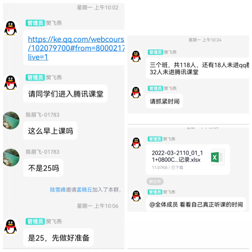 樊老师将授课内容分为三个部分:课前知识传递、课中知识内化以及课后知识基础巩固等,并通过将需要优化和调整内容回馈到课前、课中和课后各相应的环节中,使其成为一个具有持续优化的质量管控闭环。她及时联系班委建立了班级QQ群和腾讯课堂,将相关学习资料上传班级群供学生自主学习,并辅以中国大学慕课及学堂在线等学习网站的网课资源,尽最大努力确保线上教学与线下课堂的并步、同质、等效。