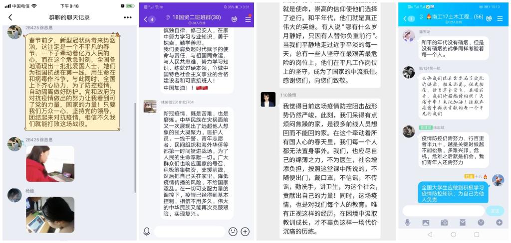 各班级同学展开热烈讨论。信息工程学院2019级通信工程03班班长李琳琳表示,收看了全国大学生同上一堂疫情防控思政大课受益匪浅,刻骨铭心。自己对中国在疫情中的担当感到骄傲自豪,同时也对新型肺炎疫情有了更进一步的了解和认识。虽然我们不能亲临主战场,但我们要坚定信心、不负韶华,在今后要努力奋斗。经济贸易学院2017级国际经济与贸易专业2班学生周志林表示,一代青年有一代青年的历史际遇和责任。作为一名青年,我们是阻击疫情、履行责任的重要力量。我们要带头履行防疫责任,坚决抵制谣言散布,积极发声、正面引导。同时自觉自律学习,做到学习不间断、效果不打折。南工青年之担当,是毅不是“疫”,我们也将自觉发扬“自强不息、格物致知”的校训精神,发挥自身力量投入防疫工作,作出自己应有的贡献。人文与艺术学院2018级设计学2班班长刘源表示,在这个战疫的关键时刻,我们上了全国大学生同上一堂疫情防控思政大课。这节课让自己意识到了千百年来,中国经历了多少艰难困苦的险阻,但我们都一一挺了过来。面对疫情,只要我们中国人民众志成城,齐心协力共同面对,没有一个冬天不可逾越,没有一个春天不会来临。士官学院2018级通信技术(火箭军)1班学生付永强表示,新冠肺炎疫情发生,我们让全世界看到了中华民族的力量,生动展现了一方有难、八方支援,全力以赴、共克时艰。作为一名学院学生干部,要坚持“停课不停学”,不断学习知识和本领,肩负起大学生应该承担起的责任。(文/刘小红 图/朱彦奇)