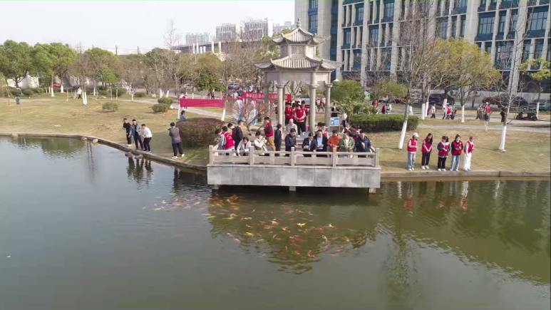 3月7日下午,我校在瑶湾水利风景区桃李亭举行“‘鱼’你有约 ‘益’起行动”——童心港湾公益行动启动仪式。校党委副书记吴泽俊出席仪式并宣布活动启动,副校长李培生,校党委委员、党委组织部部长胡俊华共同为爱心鱼食售卖机揭幕,副校长周敏丹主持仪式。与会领导在场的师生代表们一同为桃李湖里的锦鲤投放鱼食。