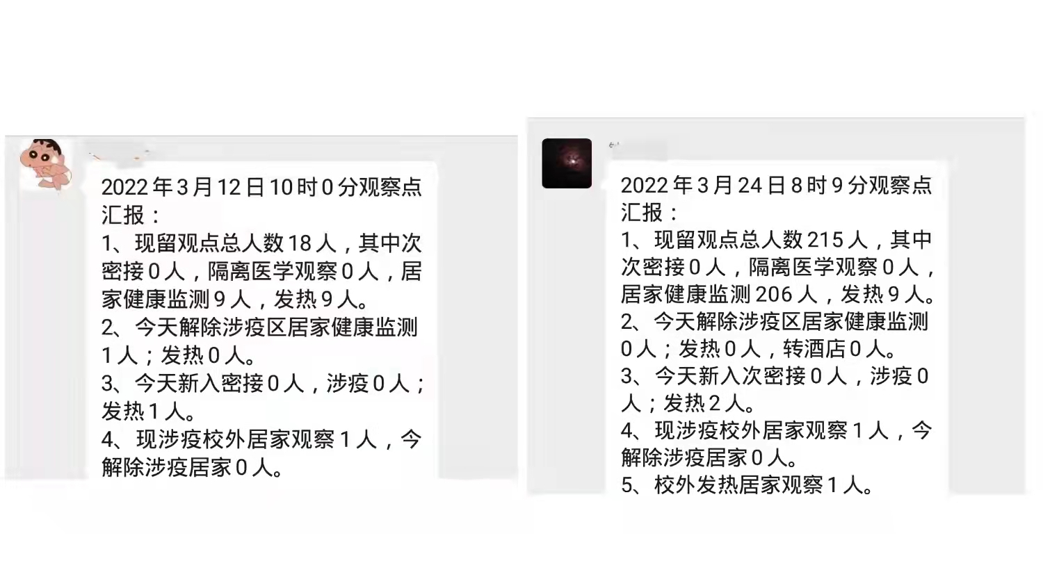 “我妈妈去哪了”,“小宝乖,妈妈去给人做核酸了,你要乖乖等妈妈”;“女儿,南昌现在疫情这么重,我知道你很忙,可是你也要好好保重身体,我就不多说了,你有空赶紧休息”;“妈妈,你今晚几点回来”,“宝贝先睡觉,妈妈过一会就回家”;“领导,我邻居家着火,我妈妈一个人在家,我很担心,我就回家看一眼,看完马上回医院”,这些对白,让人心酸。为人父母,为人子女的他们无悔自己的选择,“虽然很累,可“健康所系,性命相托”是我们医者的初心;“保障师生员工的身体健康和生命安全”是我们的使命。”他们这样说。(文/付园、熊攸圳 图/党委宣传部、团委、学生志愿者)