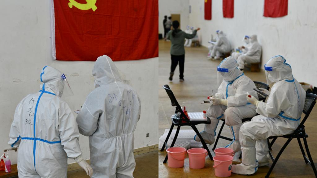 时间紧,任务重,人手少,气温骤降,所有的医务人员承受巨大压力,投入到抗疫一线。即使由于网络瘫痪,第一轮全员核酸检测工作7点30分才正式开始,大家都毫无怨言,一直坚守。在脱下防护服的那一刻,衣服早已湿透,双腿酸痛难支,体力消耗殆尽,大部分医务人员的晚饭时间已是晚上11:00。