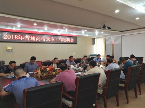 6月29日下午,我校2018年高招录取工作协调会在行政楼336会议室召开。校党委副书记张立青,纪委书记梁钢,团委、监察室、教务处、计财处、招生就业处、后勤保障处、保卫处、网络信息中心、医院等部门负责人以及高招录取工作人员参加了会议,会议由招生就业处处长熊丽克主持。