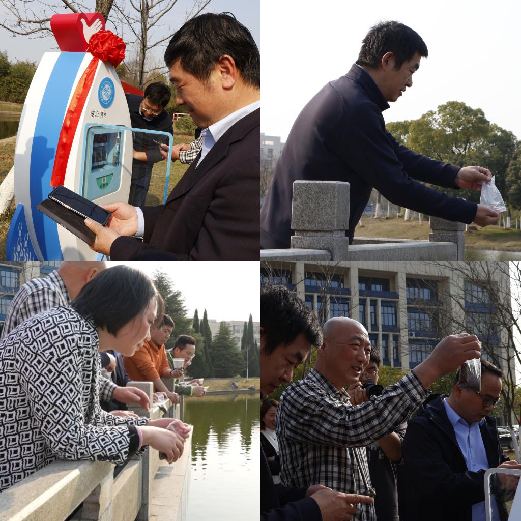 3月7日下午,我校在瑶湾水利风景区桃李亭举行“‘鱼’你有约 ‘益’起行动”——童心港湾公益行动启动仪式。校党委副书记吴泽俊出席仪式并宣布活动启动,副校长李培生,校党委委员、党委组织部部长胡俊华共同为爱心鱼食售卖机揭幕,副校长周敏丹主持仪式。与会领导和在场的师生代表们一同为桃李湖里的锦鲤投放鱼食。