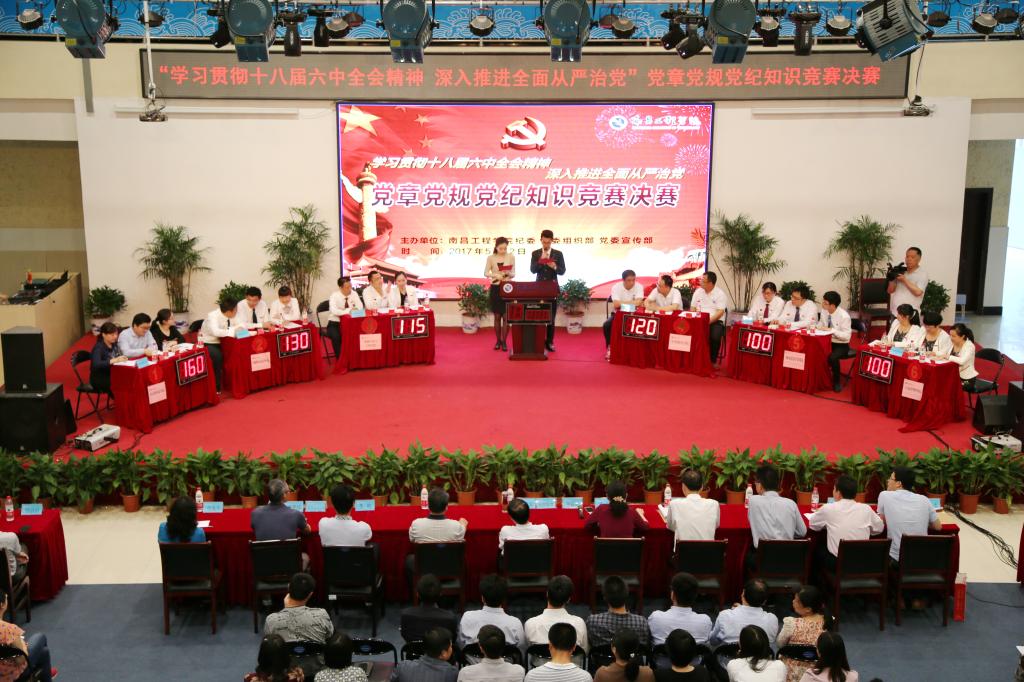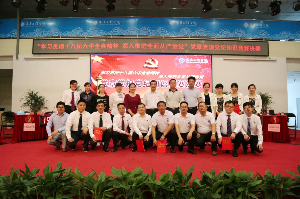为深入学习贯彻党的十八届六中全会精神,持续深化“两学一做”学习教育,强化党员党章党规党纪意识,不断推进全面从严治党,5月12日下午,校纪委与党委组织部、宣传部在大学生活动中心一楼大厅联合举办了党章党规党纪知识竞赛决赛,经过4月11日初赛晋级的六支队伍共十八名队员参加了决赛。校党委书记徐兰宾、副书记张立青、纪委书记梁钢、副校长李明亲临现场,与各单位党员代表300余人共同观看了比赛。