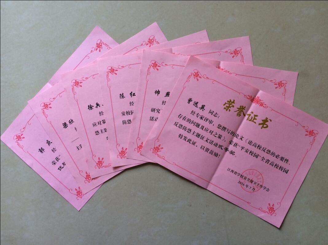 在由江西省学校安全保卫工作学会举办的“平安校园”全省高校校园反恐防恐主题征文活动中,我校师生积极响应,踊跃撰文,共获得二等奖1项,三等奖3项,优胜奖2项,为我校赢得了荣誉。(文/李丁宁 图/陈玮)