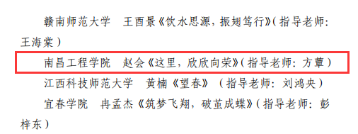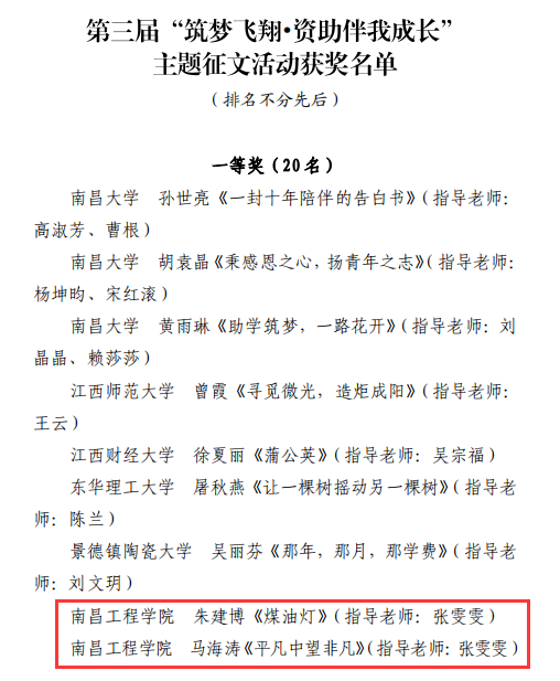 近日,省教育厅公布了江西省第三届“筑梦飞翔·资助伴我成长”主题征文活动评选结果,我校荣获优秀组织奖,推荐作品从8666篇参赛作品中脱颖而出,2019级水利水电工程专业(瑶湖学院)朱建博、2018级水利水电工程专业(瑶湖学院)马海涛荣获一等奖,2019级水文与水资源工程专业赵会荣获三等奖。