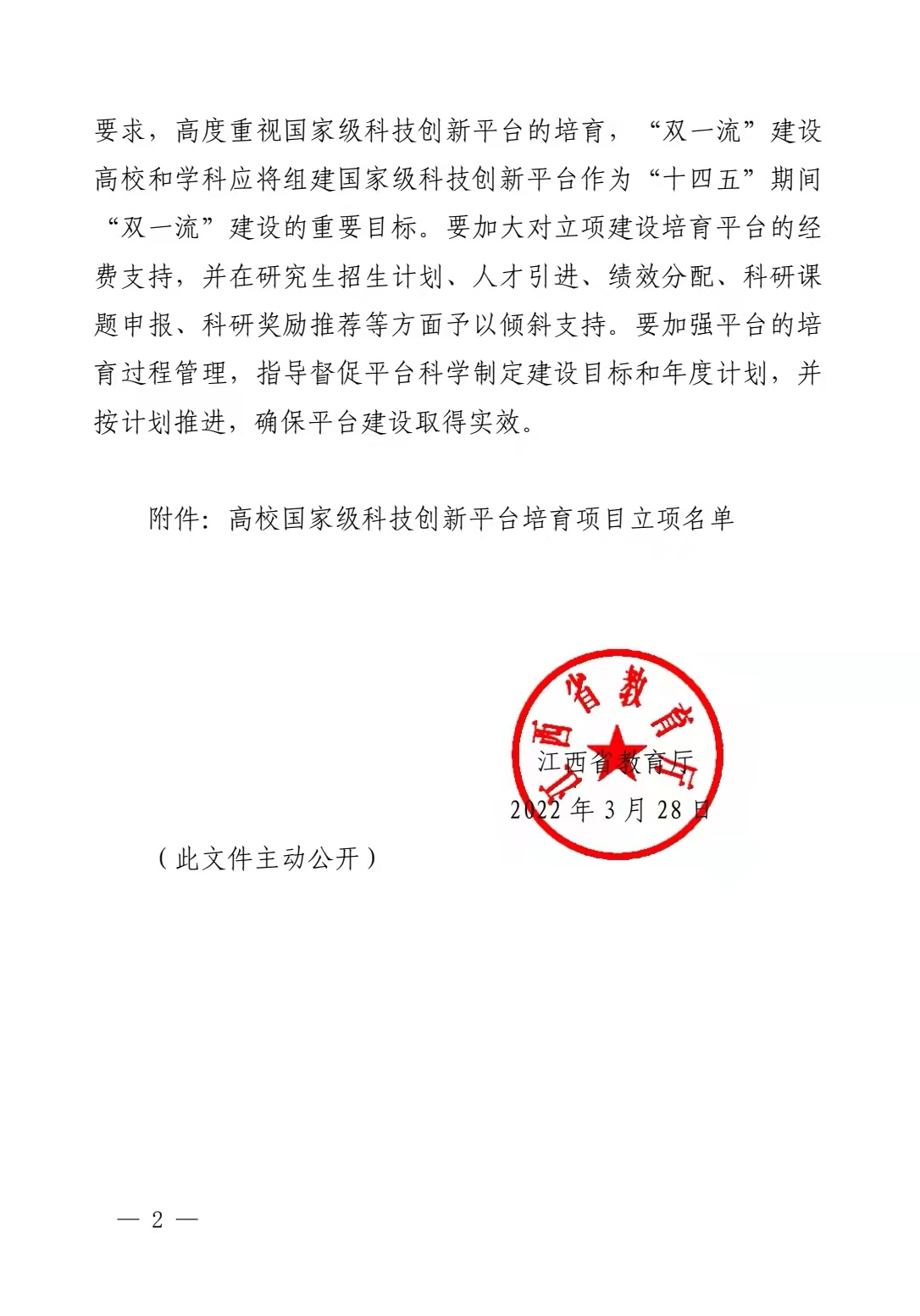 据悉,为加强我省高校国家级科技创新平台建设,支撑我省“十四五”期间“双一流”建设,助力江西高质量跨越式发展,省教育厅将在“十四五”期间培育一批国家重点实验室、国家技术创新中心等国家级科技创新平台。本次有14个项目参加申报,共10项获批立项。(文/图 崔建锋 责任编辑 周冠佳 潘旭)