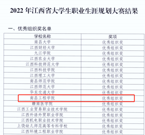 12月14日至15日,2022年江西省大学生职业生涯规划大赛总决赛举行。我校参赛的5支队伍取得了1金1银3铜的优异成绩,学校荣获“优秀组织奖”,工商管理学院教师魏汉英获“优秀指导老师”荣誉称号,招生就业处刘铃娟获“优秀工作者”荣誉称号。