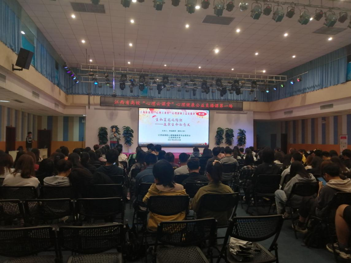 4月25日晚,江西省高校“心理云课堂”心理健康公益直播课首场直播举行,清华大学李焰教授作题为“生如夏花之绚烂——追求生命意义”讲座,校心理健康教育与咨询中心组织200余名寝室心理联络员在大学生活动中心一楼多功能厅集中观看,各学院组织学生通过网络平台观看学习。