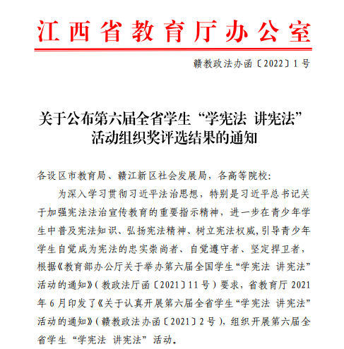 近日,江西省教育厅公布了第六届全省学生“学宪法 讲宪法”系列活动组织评选结果,我校荣获高校最佳组织奖,全省共5所高校获得该表彰。