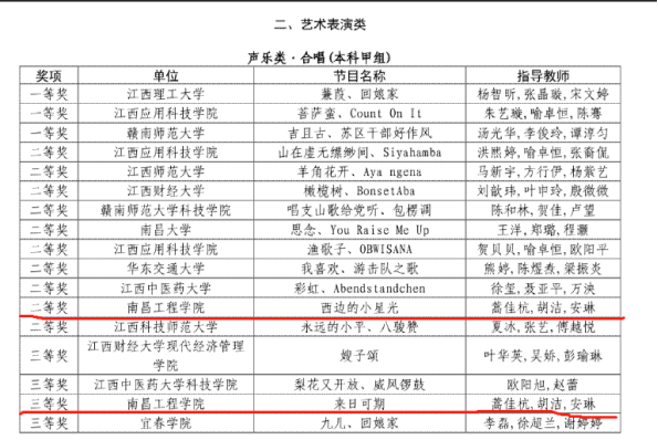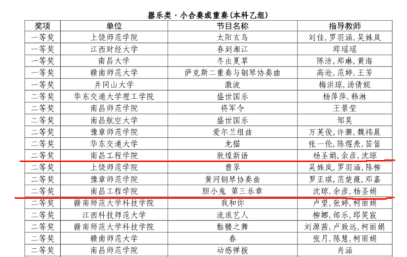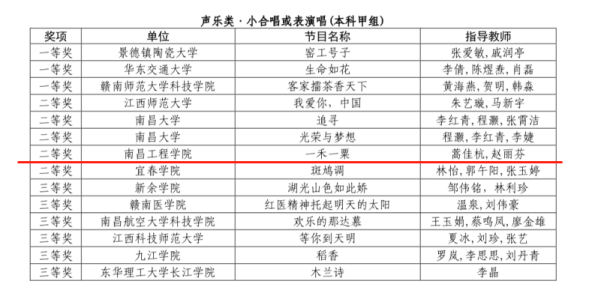 近日,江西省教育厅公布了江西省第十届大学生艺术展演活动评选结果,我校选送的为助力脱贫攻坚而原创的合唱歌曲《西边的小星光》、倡导厉行节约反对浪费的原创表演唱《一禾一粟》均获本科甲组二等奖,庆祝中华人民共和国成立70周年的原创合唱歌曲《来日可期》获得本科甲组三等奖,民乐合奏《敦煌新语》和双钢琴演奏《胆小鬼 第三乐章》两支曲目均获得本科乙组(专业组)二等奖。