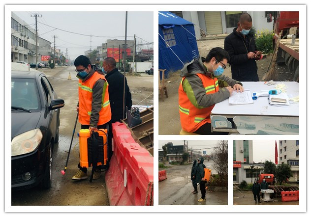 不远处驶来一辆三轮车,身穿红马甲的曹锰和执勤人员一人拿着测温枪,一人上前示意拦停车辆,测体温、登记、消毒、发宣传单,并耐心劝返,就这样开始了一天忙碌的工作。