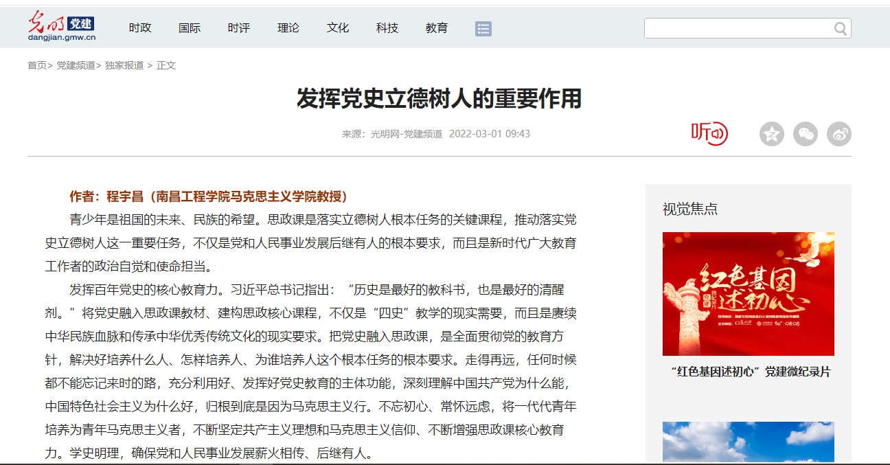 近日,我校马克思主义学院程宇昌教授在光明网刊发理论文章《发挥党史立德树人的重要作用》。