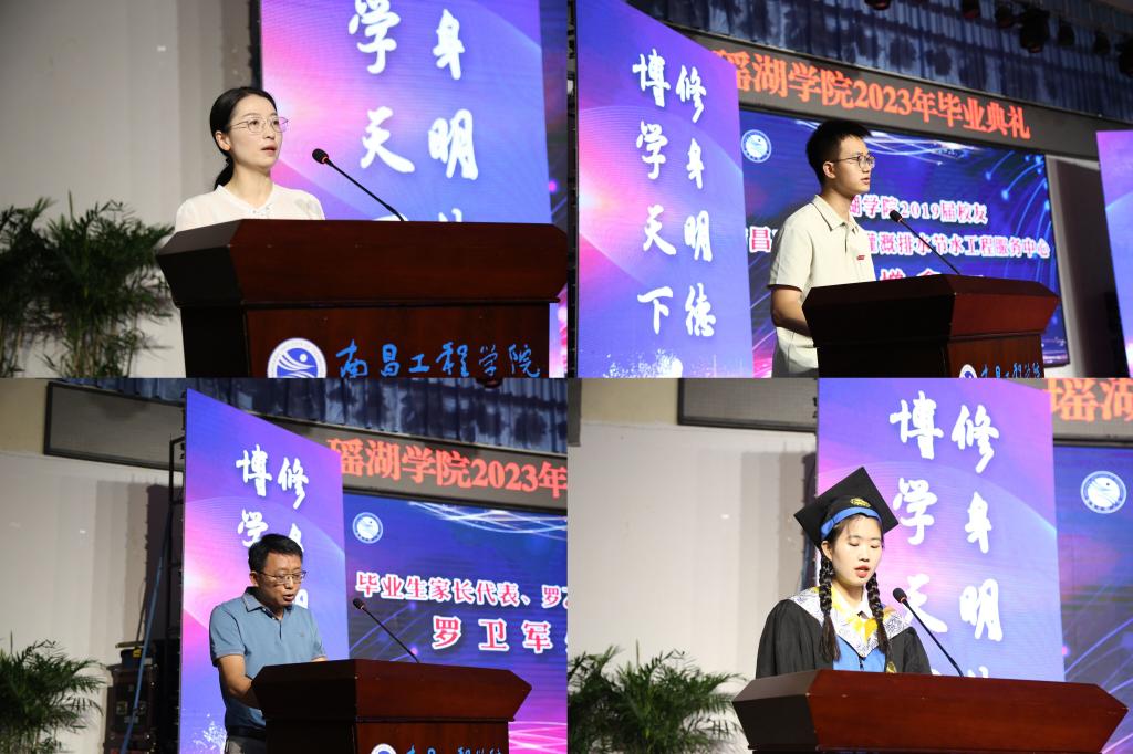 2023届毕业生代表张世乐,瑶湖学院2019届校友、南昌市高新区灌溉排水节水工程服务中心俞增鑫,瑶湖学院“最美教师”姜璐,毕业生家长代表罗卫军分别发言。