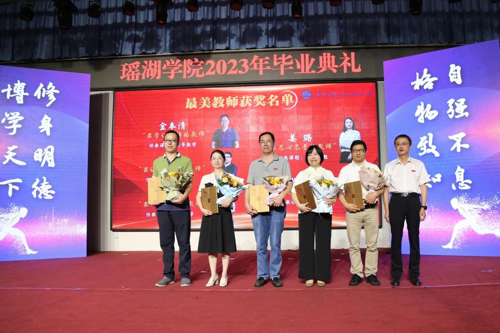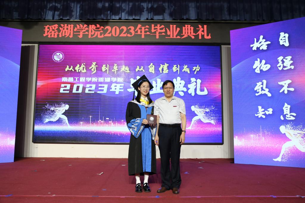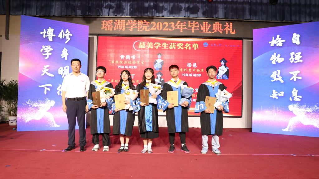 金志农、陆伟锋为瑶湖学院2023年“最美教师”“最美学生”颁奖。学生代表向获奖老师和毕业生献花。