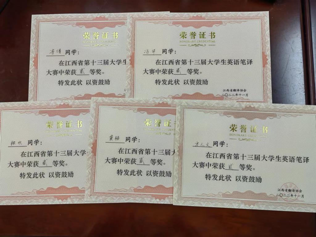 11月13日,由江西省翻译协会主办的江西省第十三届英语笔译大赛落下帷幕,来自南昌大学、江西师范大学等省内20所高校的近300名选手参赛。我校2019级英语专业李倩,2019级翻译专业龚韫,2020级英语专业冯华、方人文、叶宁以及2021级审计学专业张欢等6位同学荣获二等奖;2021级编辑出版学专业涂锐敏、2020级翻译专业杨振亿等6位同学获得三等奖。(文/熊婧 图/王佳 责任编辑 潘旭 徐金兰)
