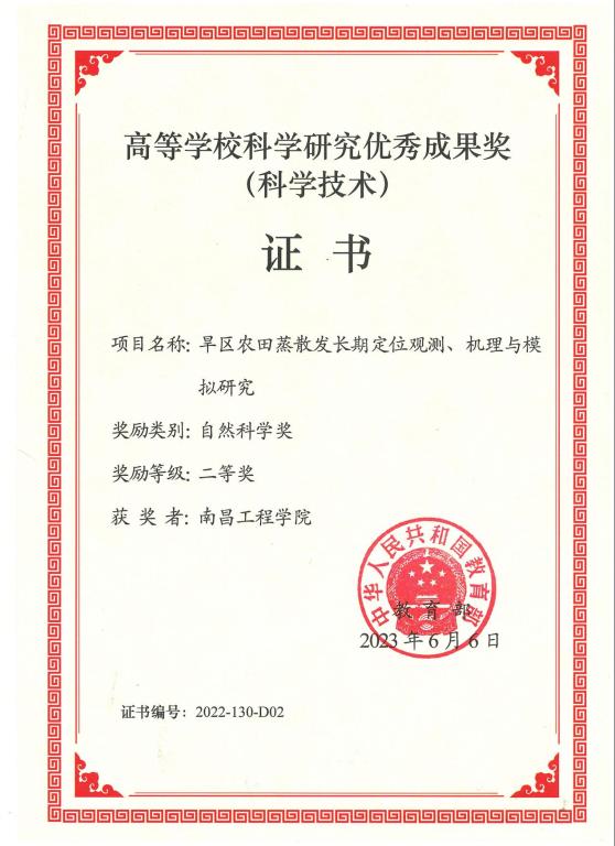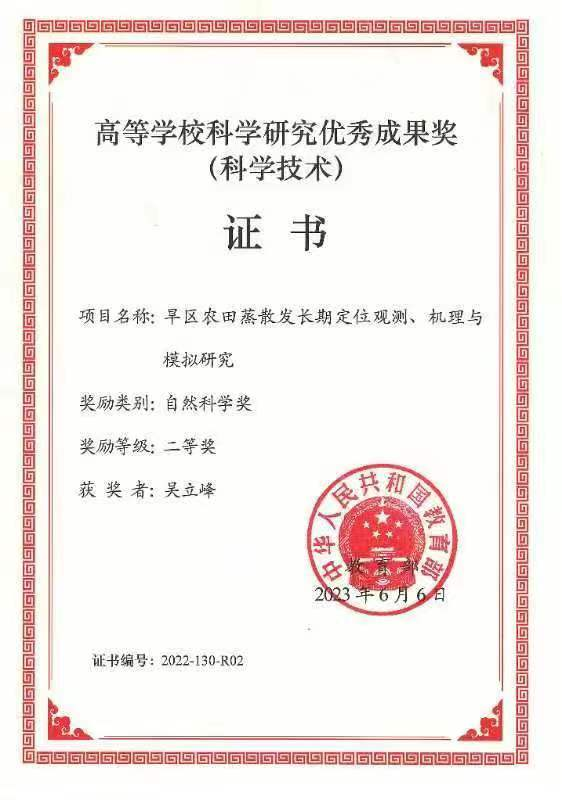 近日,教育部召开全国高校科技创新暨优秀科研成果奖表彰大会,公布了《教育部关于2021、2022年高等学校科学研究优秀成果奖(科学技术)奖励的决定》。由中国农业大学主持,我校为第二完成单位,我校水利与生态工程学院吴立峰博士作为第二完成人参与的“旱区农田蒸散发长期定位观测、机理与模拟研究”项目荣获教育部高等学校科学研究优秀成果奖(科学技术)自然科学奖二等奖,这是我校首次获得该奖项。