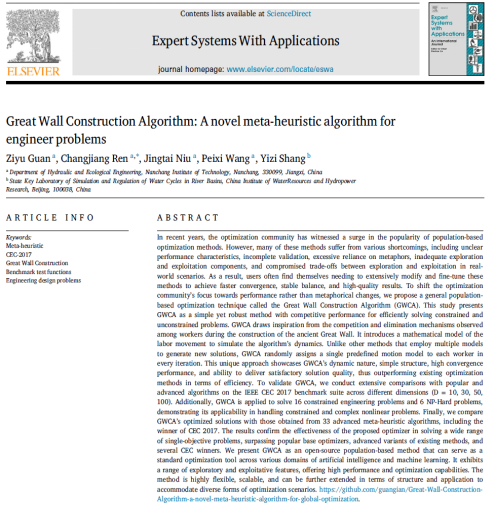 2023年7月28日,我校瑶湖学院2020级水利水电工程本科生官子愈(第一作者)、王沛希等同学,在国际著名学术期刊Expert Systems With Applications(ESWA),发表了题为“Great Wall Construction Algorithm: A novel meta-heuristic algorithm for engineer problems”的科研论文。这是我校本科生首次以第一作者身份在人工智能高水平期刊发表前沿领域文章,实现了本科生发表top期刊零突破。ESWA期刊为人工智能学科Top期刊,影响因子8.7,ESWA专注于交流世界各地工业、政府和大学应用的专家和智能系统的相关信息。