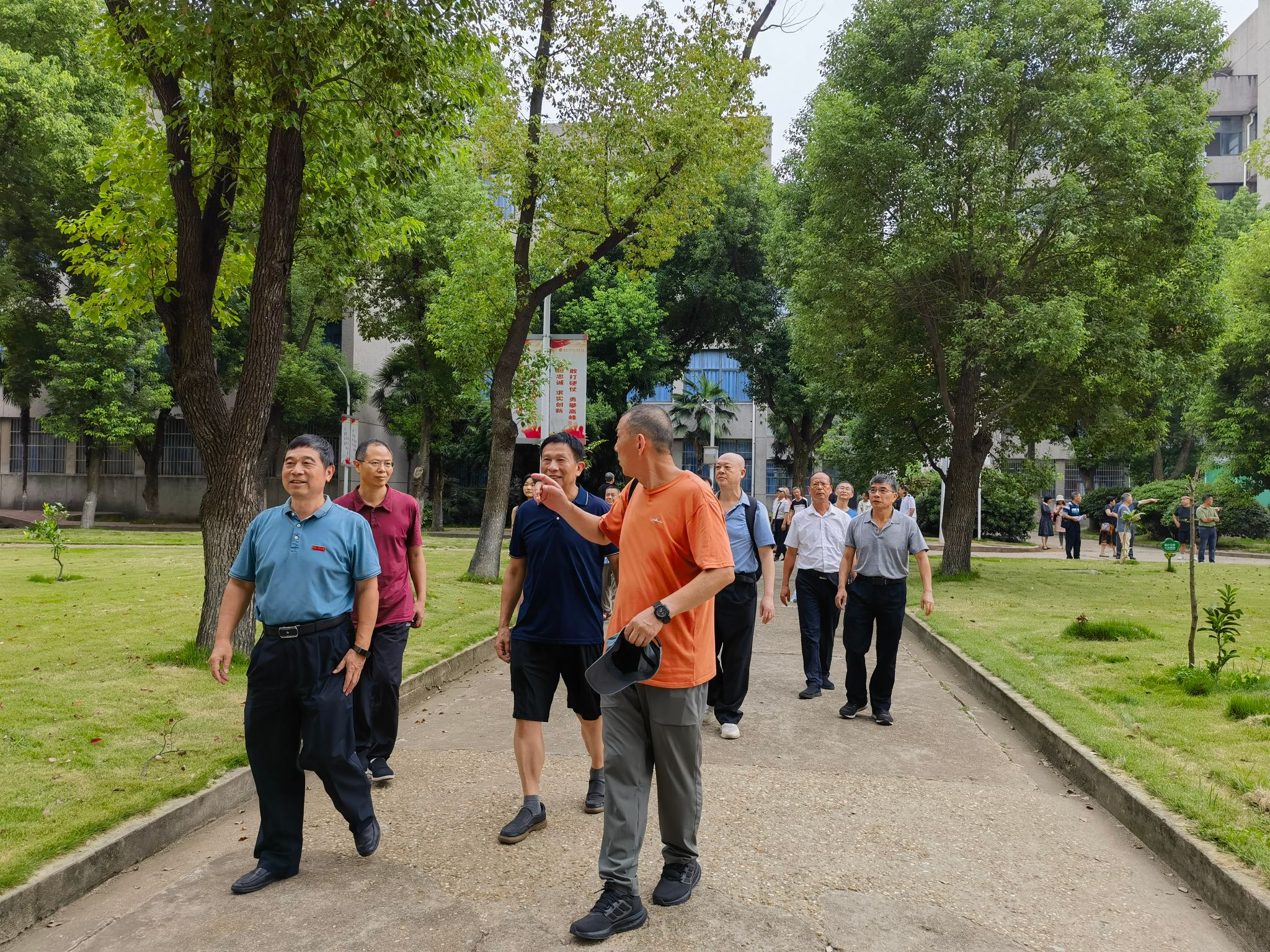 校友们重游校园并合影留念。漫步在曾经学习和生活的校园里,徜徉在曾经住过的宿舍楼道,大家纷纷感叹,一草一木历历在目,所见所闻倍感亲切。