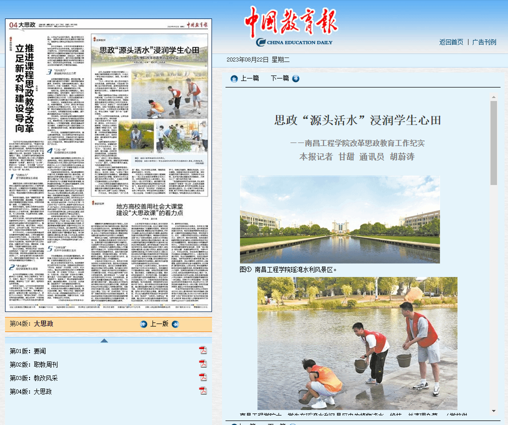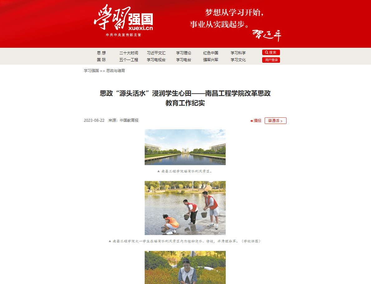 近日,中国教育报、“学习强国”学习平台等主流媒体以《思政“源头活水”浸润学生心田——南昌工程学院改革思政教育工作纪实》为题,对我校思政教育改革工作进行了专题报道。