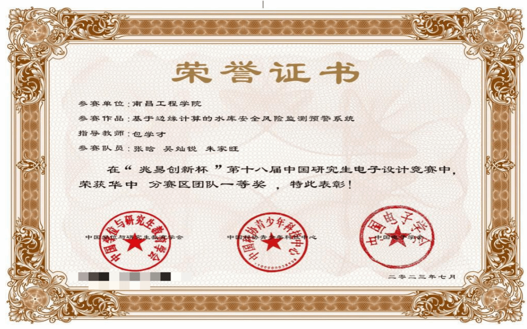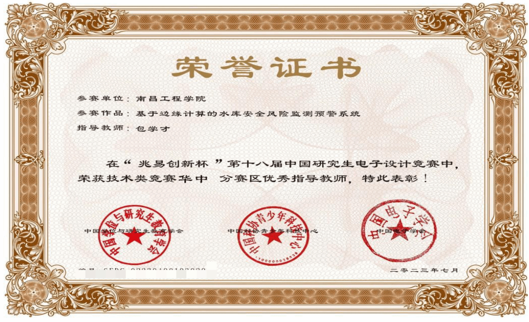 近日,由教育部学位管理与研究生教育司指导,中国电子学会、中国学位与研究生教育学会、中国科协青少年科技中心共同主办的“兆易创新杯”第十八届中国研究生电子设计竞赛华中赛区决赛在南昌航空大学举行。由我校信息工程学院包学才教授指导,2021级电子信息专业张晗、吴灿锐和朱家旺3名研究生共同完成的“基于边缘计算的水库安全风险监测预警系统”项目荣获技术竞赛组华中赛区一等奖,包学才被评“优秀指导教师”,这是我校首次组织学生参加此次赛事并获得佳绩。