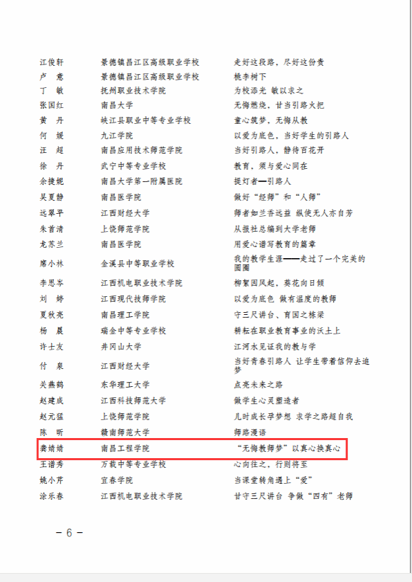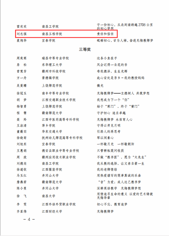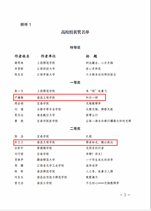近日,江西省教育工会通报了“中国梦·劳动美—凝心铸魂跟党走 团结奋斗新征程”征文活动的评选结果,我校共4位教师获奖。其中,工商管理学院卢建峰老师的《和你一样》荣获一等奖,人文与艺术学院车兰兰老师的《师者如光,微以致远》,后勤保障处刘志强老师的《责任和信任》荣获二等奖,水利与生态工程学院龚婧婧老师的《“无悔教师梦”以真心换真心》荣获优秀奖。