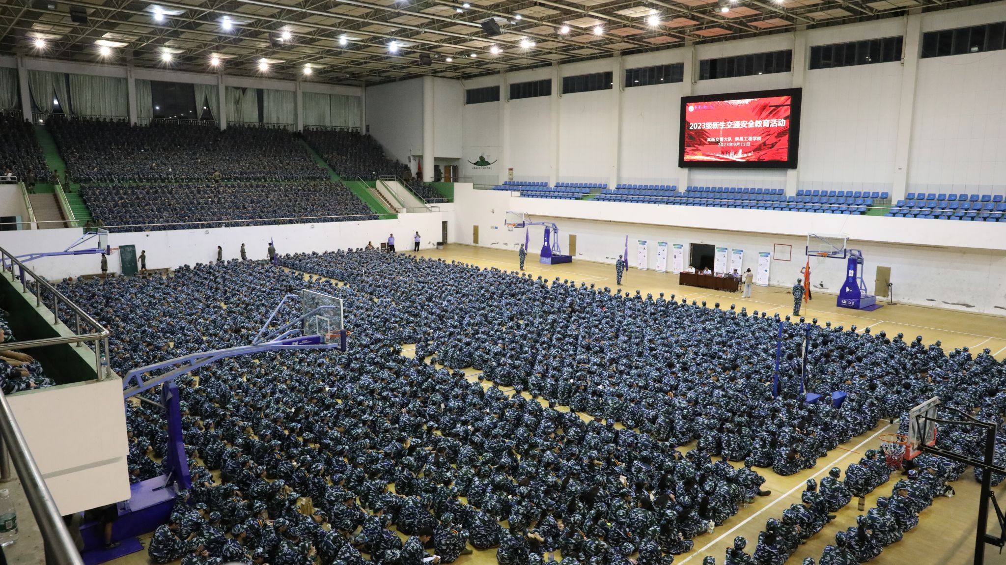 9月15日晚,我校保卫处加强校地联动共建,联合南昌市公安局、高新公安分局、光伏派出所、昌东交警中队开展了以“警民同心、安全同行”为主题的2023级新生安全教育第一课,进一步普及安全知识,提升安全防范意识,近5000名新生参加。