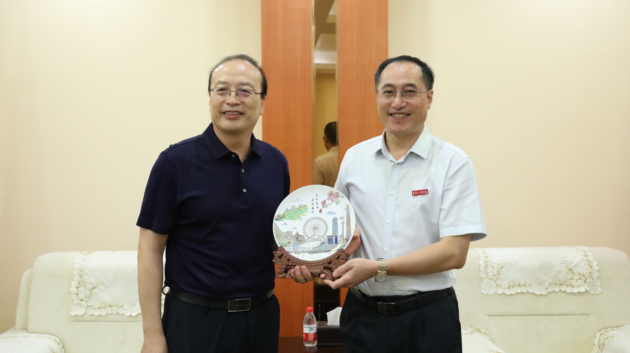 汪胜前代表学校对袁新河回到母校表示欢迎和感谢,亲切询问了袁新河的近况,简要介绍了学校近年来的发展情况,表示学校将继续提高人才培养质量,培养出更多杰出人才。袁新河对母校的关心关怀表示感谢,对受邀出席开学典礼深感荣幸,并向学校赠送“魅力津沽——手绘艺术看盘”,祝愿母校越办越好。(文/刘琴琴 图/潘旭 责任编辑 潘旭 罗婷)