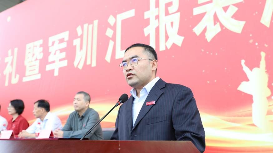 校党委书记汪胜前宣布军训汇报表演开始,并代表学校向承担2023级军士生军训任务的部队代表颁授锦旗。